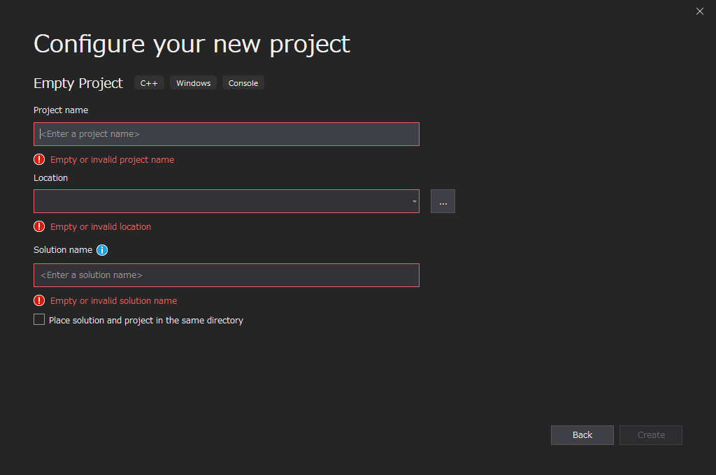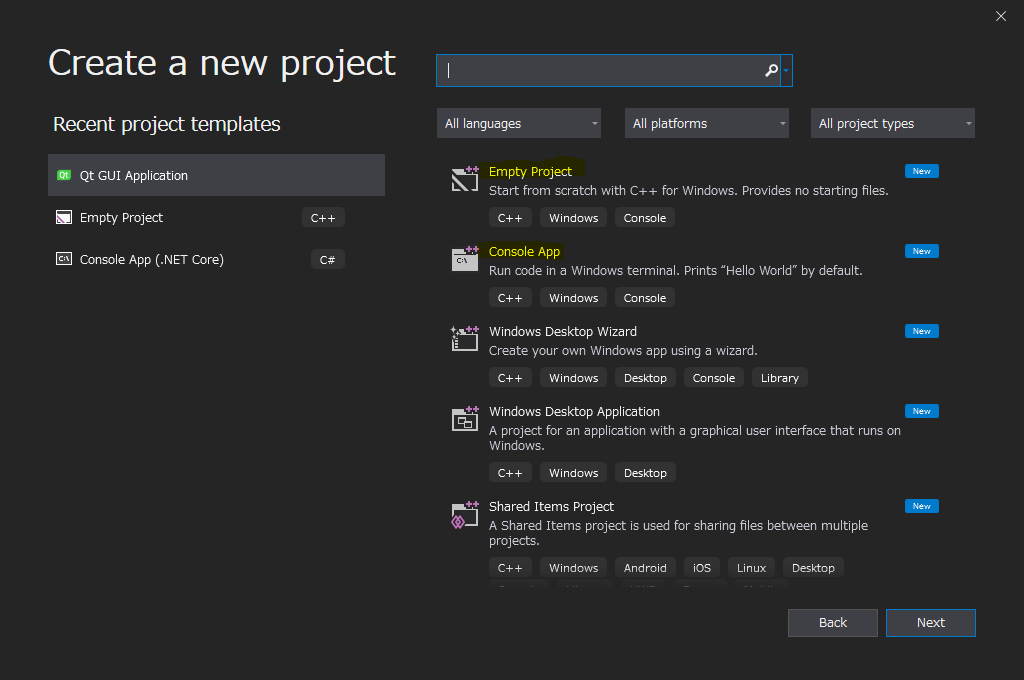 MSVC 2019 provies hunderes more project options depending on the porpose of your program, but here you simply choose either "Empty Project" or "Console App".